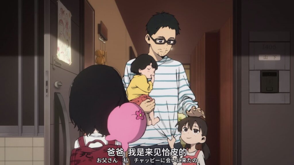 - 原生家庭: 《哔》中三个原生家庭全部都存在比较严重的问题,两个单亲家庭,一个因丈夫出轨而濒临崩溃;故事中大多借用儿童的低视角,甚至常常用到没有头部的父母形象,半遮半掩的叙述着原生家庭环境对三位主人公内心世界的巨大影响,从久世静的孤独与隐忍,到茉莉奈的暴躁与愤世嫉俗,以及东直树的努力与嫉妒似乎都有着明确的出处;更进一步,通过只言片语的侧面描述,透露出这些原生家庭问题背后有着更为复杂的社会、人性方面的原因,从工作压力与家庭不合催生出的逃避和放纵心态、被抛弃后的转向发泄,到奋斗信条衍生出的过高期待与控制倾向;《哔》将原生家庭问题设定为不可解决甚至缓解的既定事实,暗黑氛围拉满,但过于夸张和沉重了;