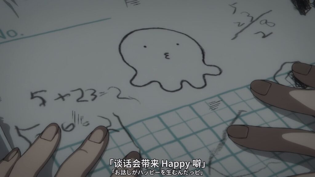 - 沟通: 东直树最后和哔说的那句话最直白:“如果你见到另一个我,帮我告诉他,试着和哥哥吵一架吧”,沟通,哪怕是争吵,也是在解决问题,从而避免让问题越滚越大。而在哔牺牲自己让久世静最后一次利用时光照相机,在返回的时间线中,茉莉奈再次霸凌,却因偶然看到本子上画着的章鱼哔形象突然停手,两个女孩因模糊的共同回忆而落泪,那句“谈话会带来Happy噼”,再一次点明题眼,沟通、谈话是最重要的事情。